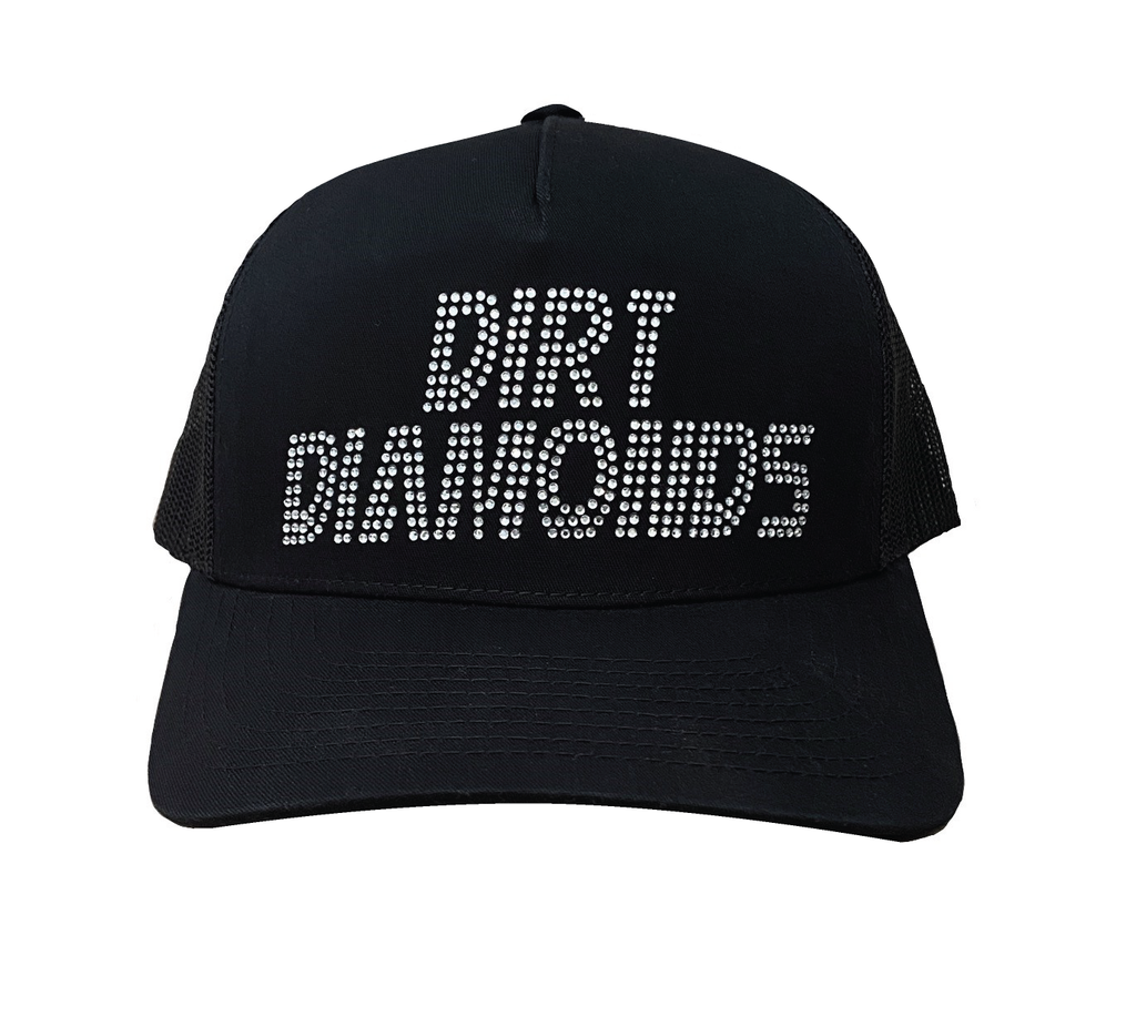 This hat features crystal white rhinestones centered on a five-panel crown, mesh, curved bill snapback.